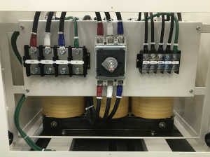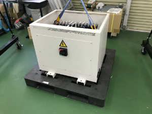 輸入産業機械の電源仕様3相4線AC400Vを供給する為、200VからのUPトランスを収納した電源BOXです。1時側、2時側には接続作業性UPの為、端子台を設置しており、ブレーカーは外部ハンドルにてON・OFF可能としております。容量は65kVAでした。