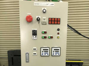 湿式多板クラッチシステム性能評価試機内の潤滑油温調制御、圧力、流量制御及び監視、運転操作ボタン等を配置した制御盤の製作でした。